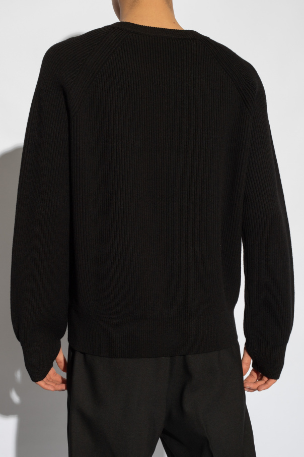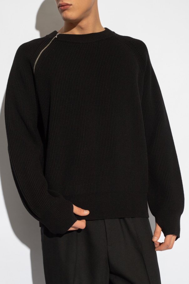 Black crewneck sweater from Burberry. Crafted from wool with a rib knit, this style features a zipped shoulder with a colourful check panel underneath, long sleeves and elasticized trims on the edges.