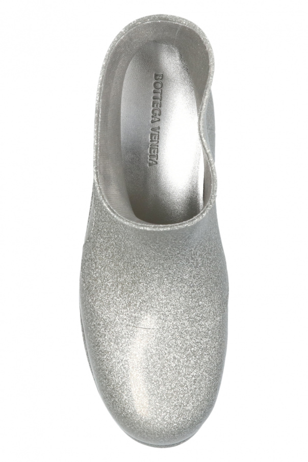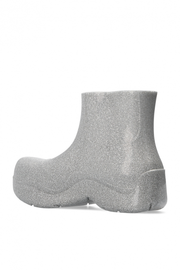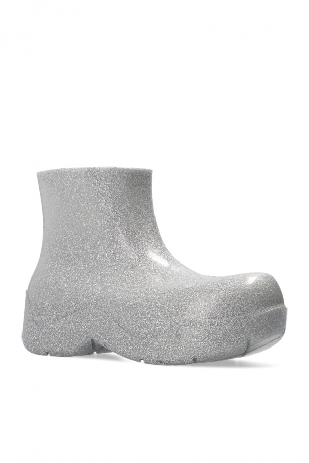 Short silver-tone ‘Puddle’ rain boots with a glitter finish from Bottega Veneta. Made of biodegradable materials, this seamless pair features a cotton lining and a silver-tone rubber sole.