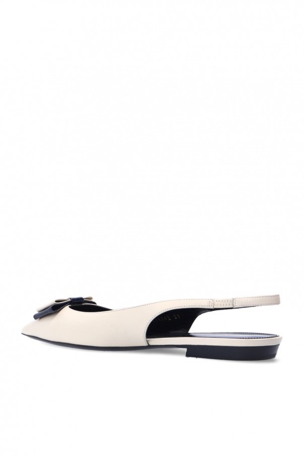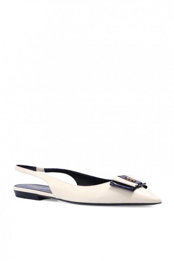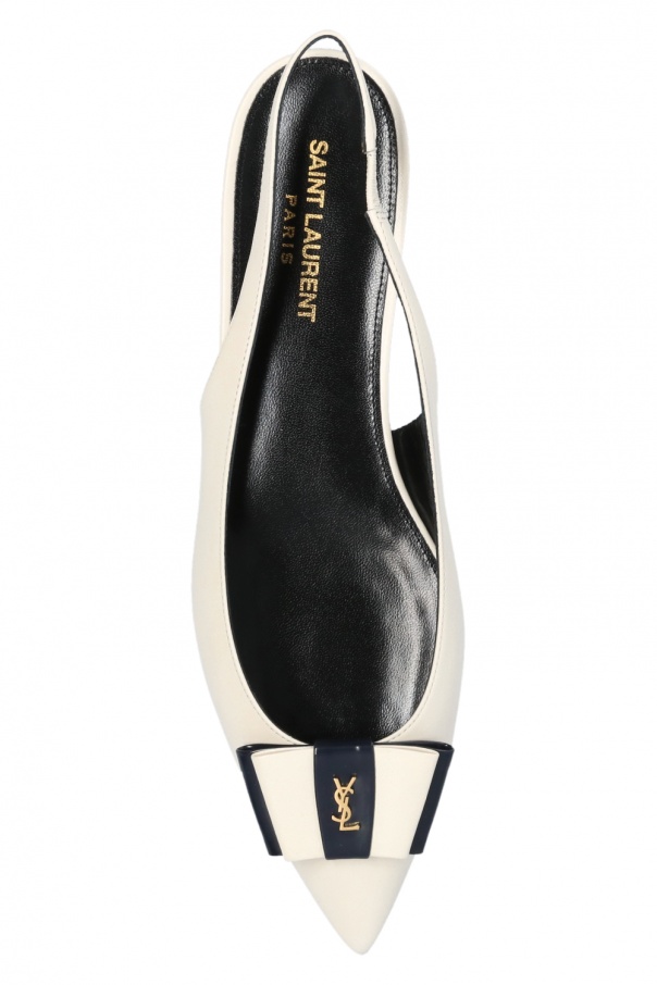 Cream and black 'Anais' slingback ballet flats from Saint Laurent. Enriched with a bow with an accompanying YSL monogram plaque, this leather-crafted pair sits on a black leather sole.