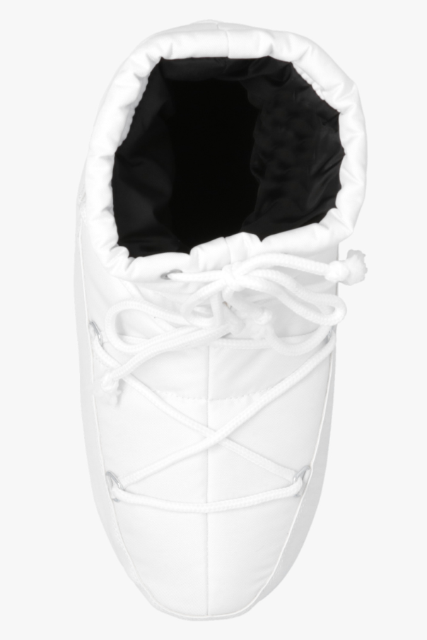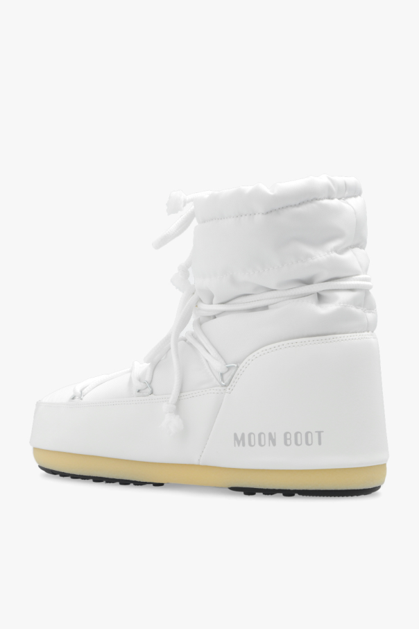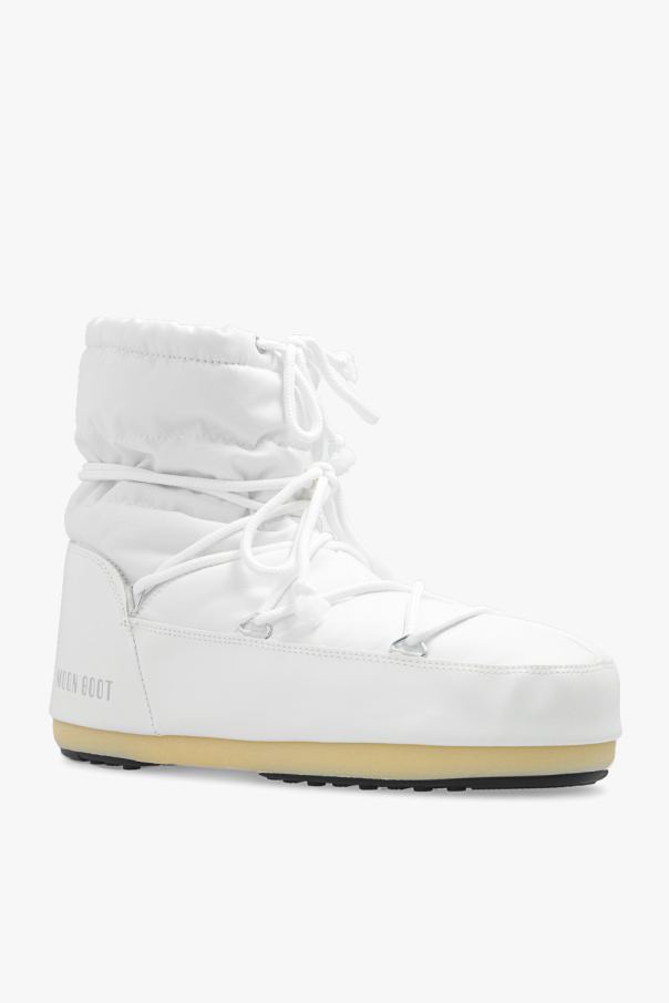White ‘Light Low’ snow boots from Moon Boot. This pair features double tie fastenings, grey logo print and rubber sole in cream and black. Inspired by the peculiar shape and technology of the astronauts’ boots, the iconic style was designed in 1969 after the first Moon landing.