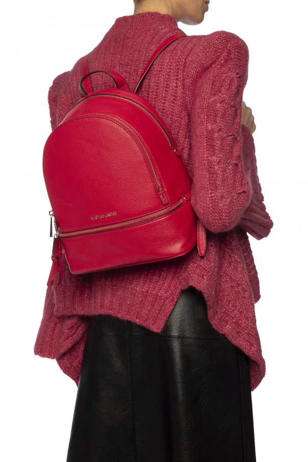 Red ‘Rhea’ backpack from Michael Michael Kors. Made of leather. Zip fastening. Decorated with a gold-tone metal logo. Two zip pockets on the front. Half-round handle, adjustable shoulder straps. Beige lining. One compartment, a partition, a zip pocket, 4 slip pockets and a carabiner strap inside.