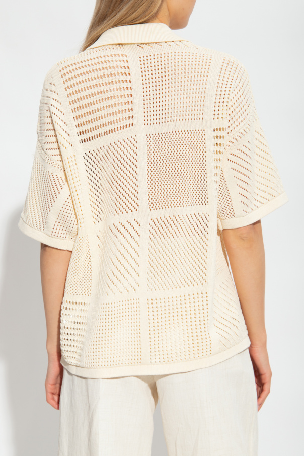 Cream ‘Talissa’ openwork shirt with a collar from Nanushka. Crafted from a blend of cotton, paper fibre and rayon, this style features a relaxed fit, pearly buttons, short sleeves and elasticized trims.