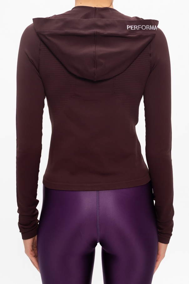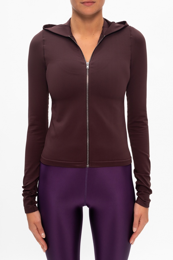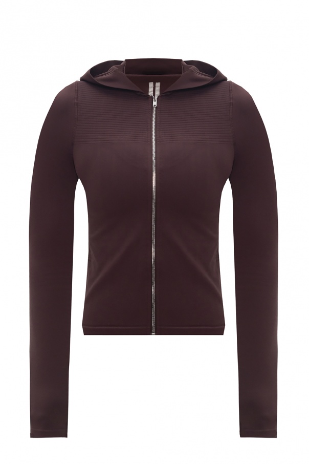 Maroon sweatshirt with a drawcord-adjustable hood from Rick Owens DRKSHDW. Crafted from stretch fabric, this hoodie features zip fastening, long sleeves and white lettering embroidered on the hood.