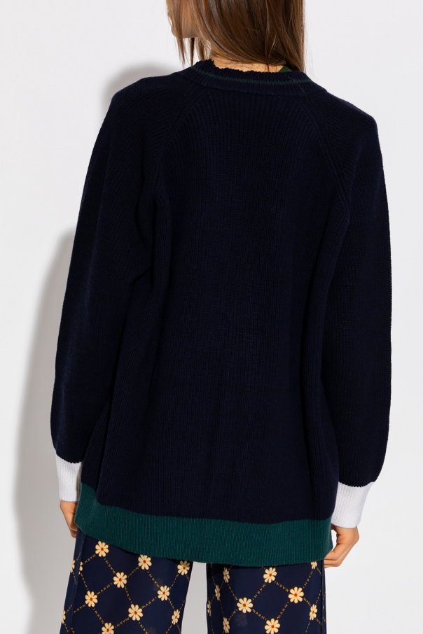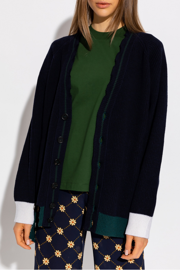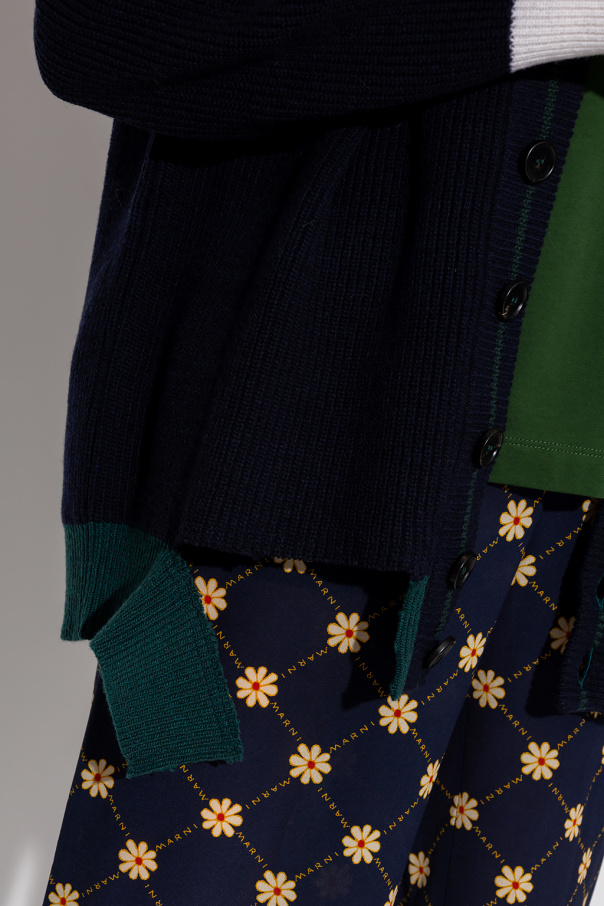 Navy blue, green and white cardigan from Marni. Crafted from a wool and cotton blend with a vintage treatment, this style features button fastenings, a logo patch on the front and ribbed trims on the bottom hem and cuffs.