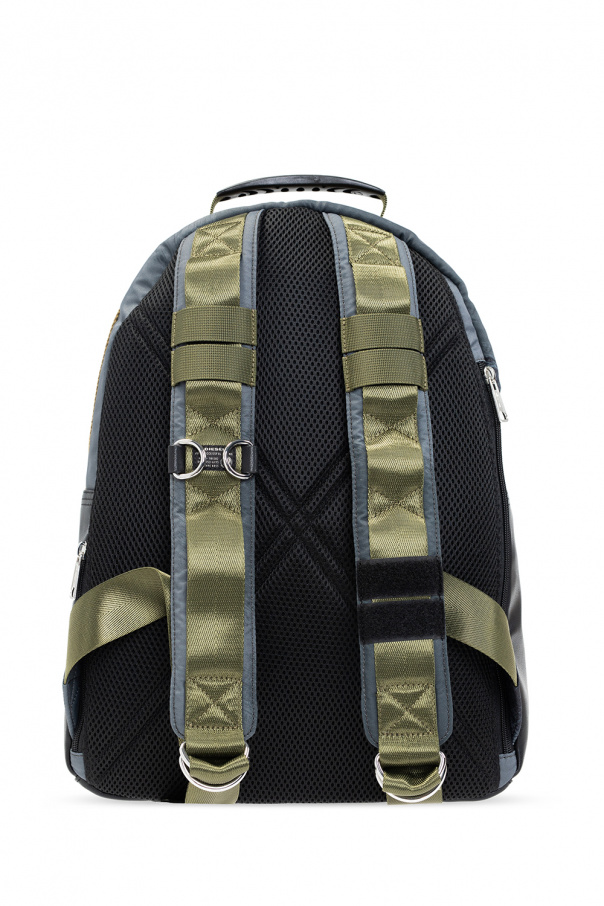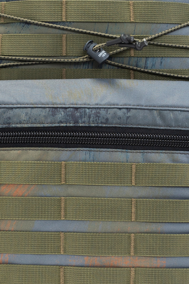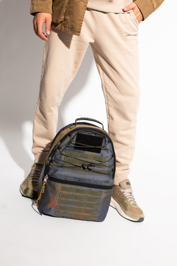 Dark green 'Tribal Lyonel' backpack from Diesel. Fastened with a two-way zip, this design features an external zip pocket on the front, adjustable shoulder straps accentuated with a logo patch, silver-tone metal hardware and one internal compartment with two slip pockets and one zip pocket.