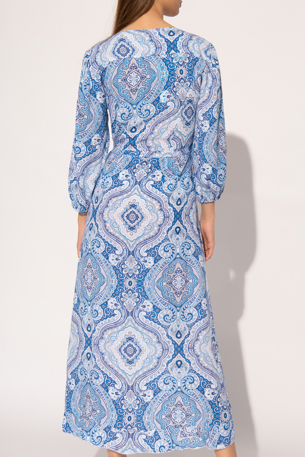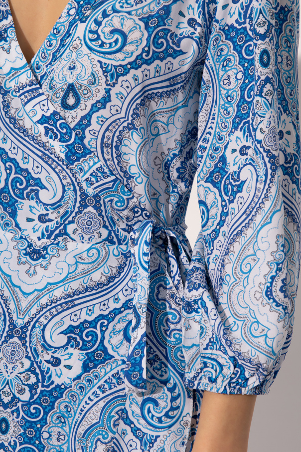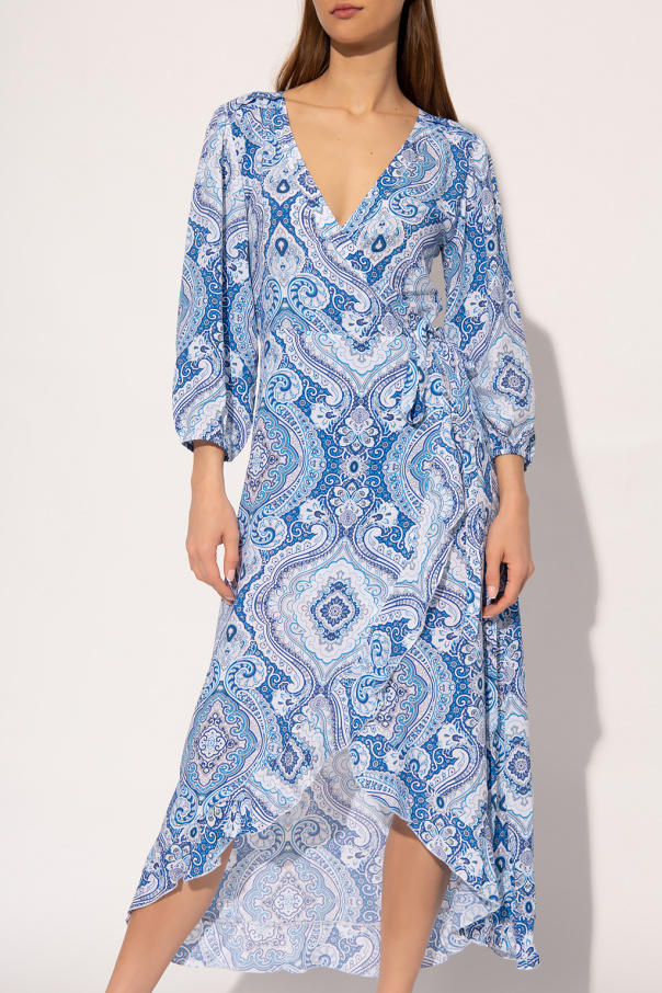Blue, white and navy blue ‘Taylor’ beach dress from Melissa Odabash. Embellished with the ‘Paisley Blue’ pattern, this style features a wrap around silhouette with a self-tie waist, a V-neckline, cropped sleeves and a ruffled hemline.