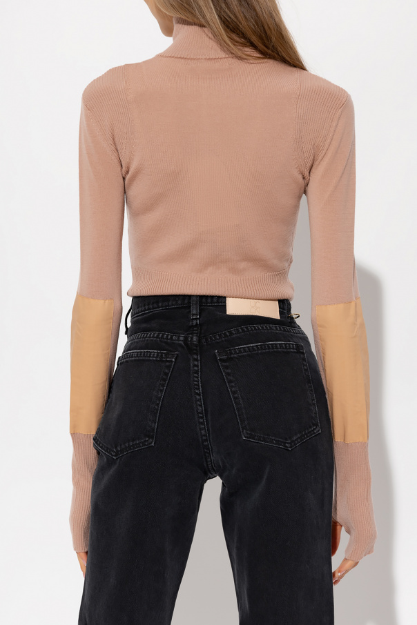 Pink ‘Drew’ sweater from Ulla Johnson. Crafted from wool with a form-fitting silhouette, this style features a standing collar, front button fastenings, beige sleeve patches and ribbed trims on the edges.