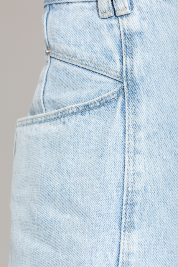 Light blue ‘Vetan’ high-waisted jeans from Isabel Marant. Fastened with a zip and button, this pair is complete with a brown logo-embossed patch at the back, five slip pockets and loose-fitting, tapered legs with a vintage effect.