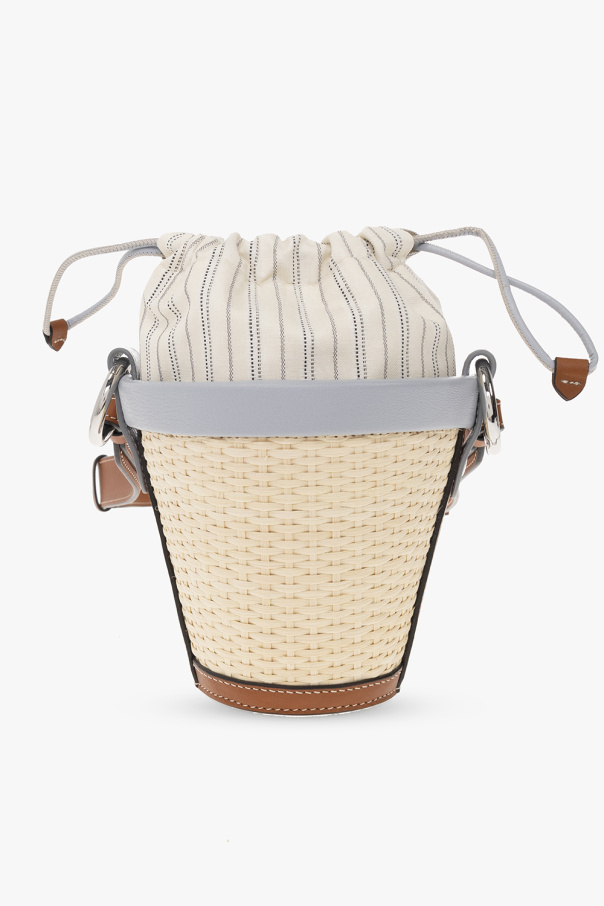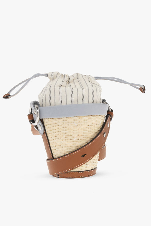 Cream, brown and blue 'Fire' shoulder bag from Maison Margiela. Woven from raffia, this model is complete with drawstrings, a pinstripe pattern, detachable and adjustable strap, one internal compartment and silver-tone metal hardware.