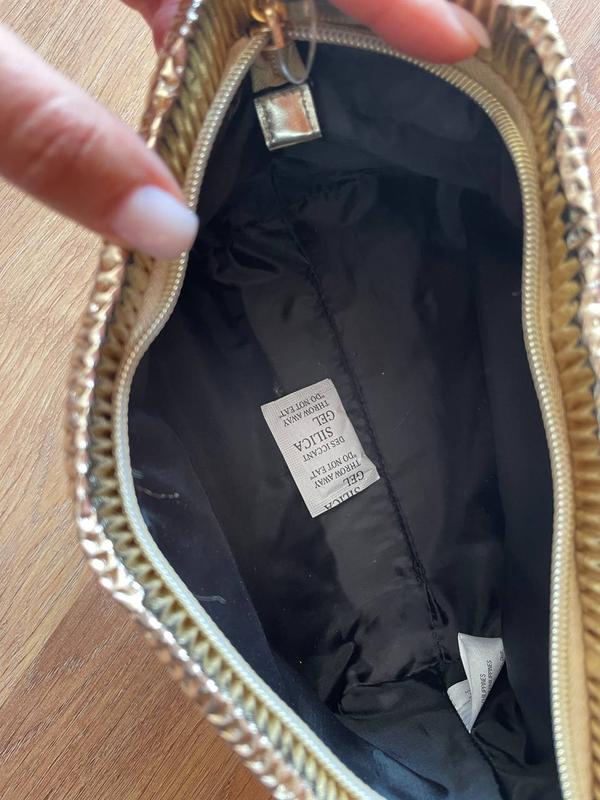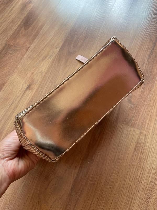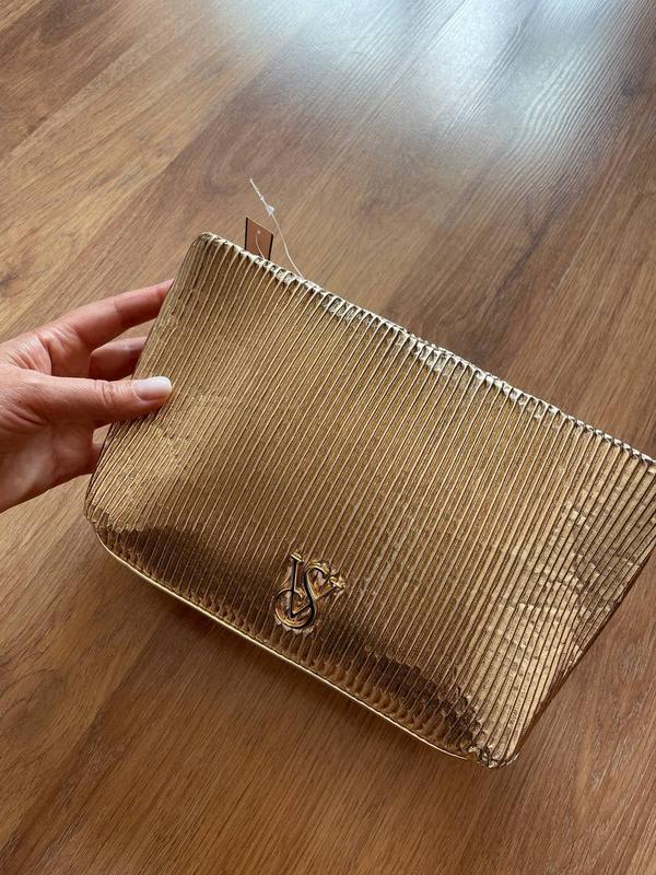 Смелая и яркая,особливая косметичка золотистого цвета. Создано для мелких повседневных вещей, в том числе спрея и лосьона, макияжа и других предметов красоты Можно использовать его как вечернюю сумку.
