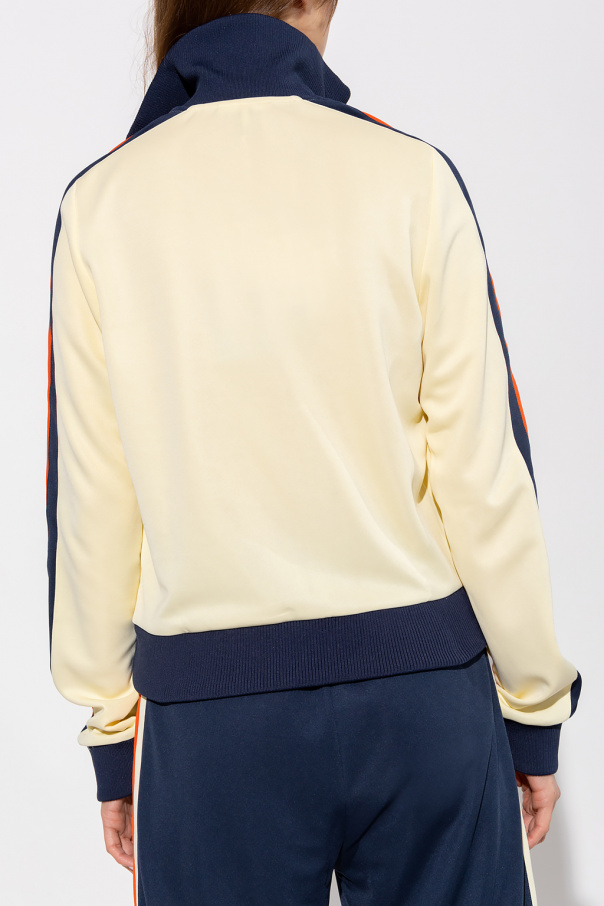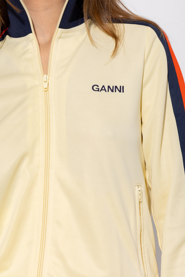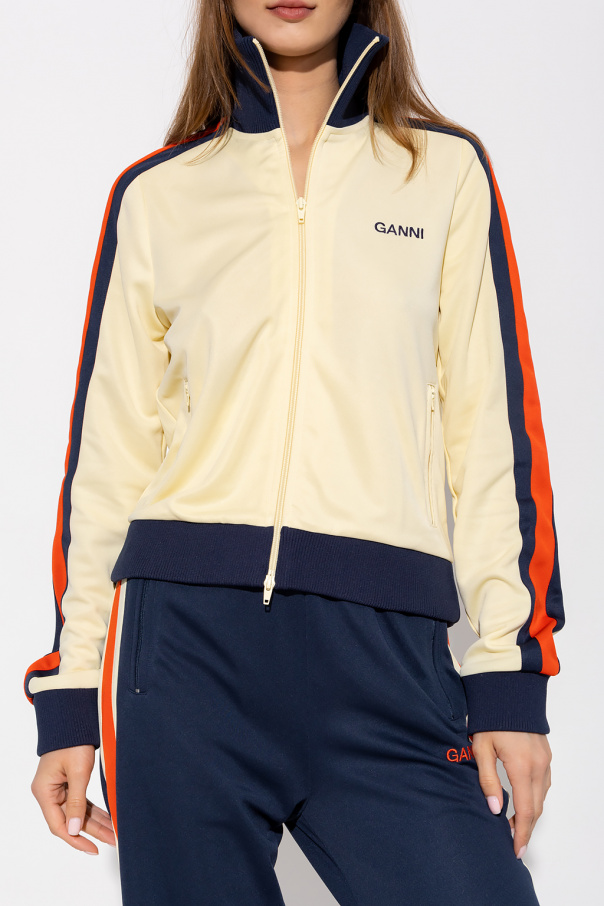 Cream sweatshirt from Ganni. Made in part from recycled fabric, this garment features a two-way zip, navy logo embroidery, two zip pockets, decorative stripes in red and navy as well as ribbed trims at the stand-up collar, hem and cuffs.