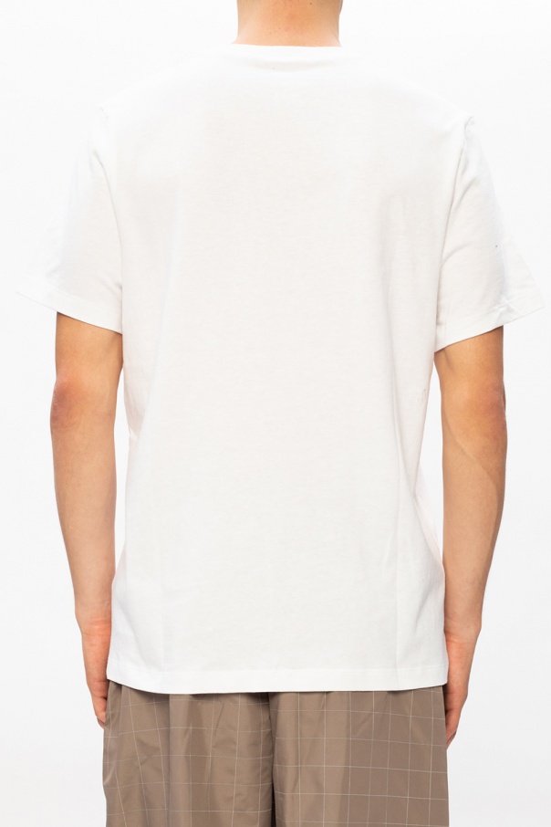 White crewneck T-shirt from Nike. Crafted from cotton, it features a Swoosh print in blue and orange.