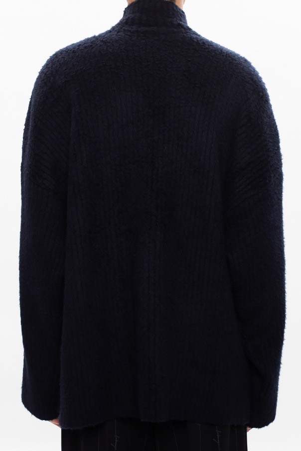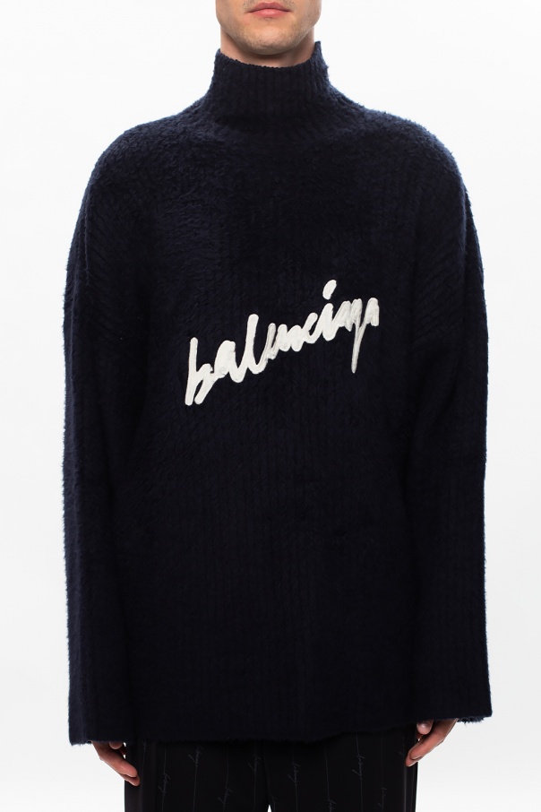 Navy blue sweater from Balenciaga. Knitted from textured cotton, this turtleneck design is complete with a white logo appliqué.
