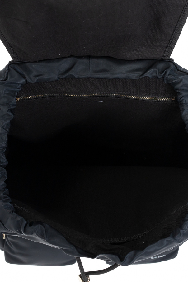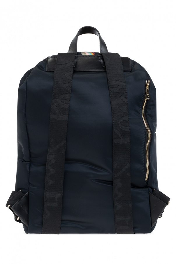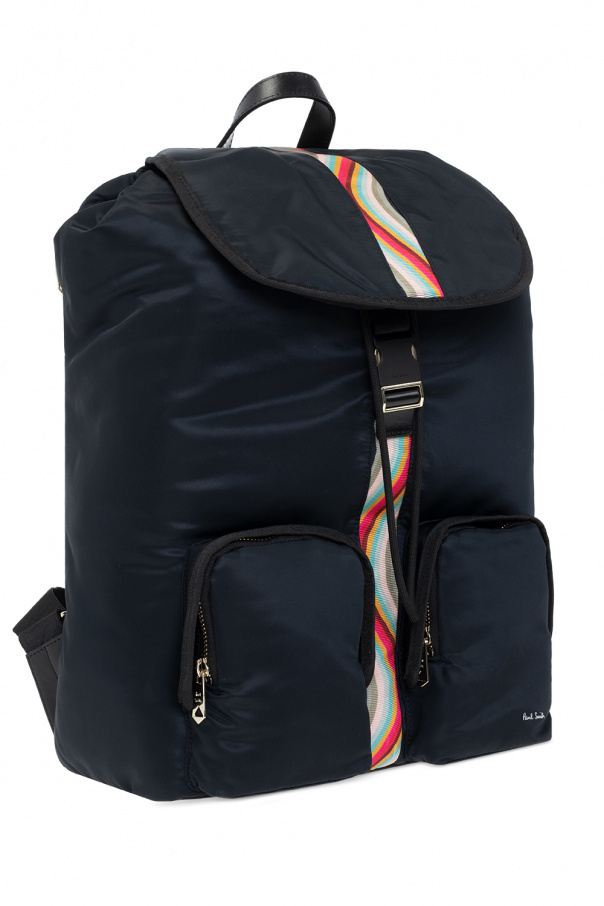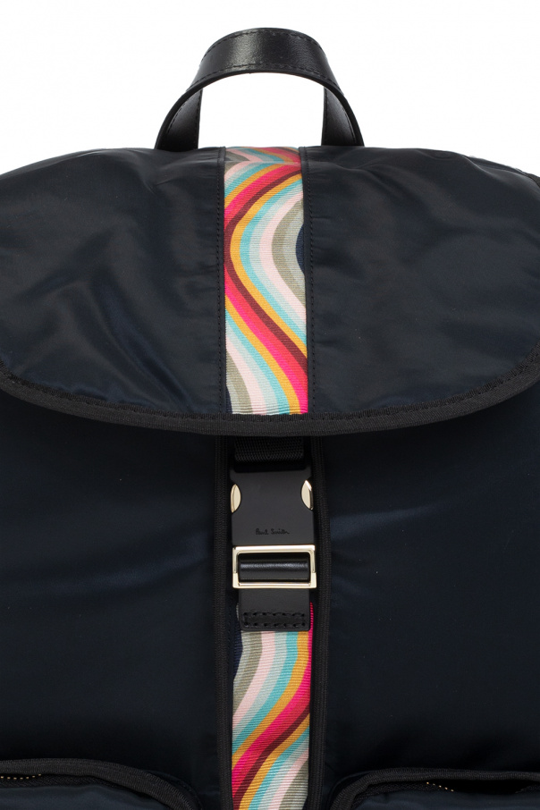 Black backpack from Paul Smith. Embellished with a white logo and the ‘Swirl’ stripe detailing, this design cinches closed with drawstrings and features a branded buckle closure, two zipped pockets, a vertical zip pocket on the back, adjustable shoulder straps with an embroidered logo, gold-tone metal hardware and one internal compartment with one zipped pocket and a laptop sleeve.
