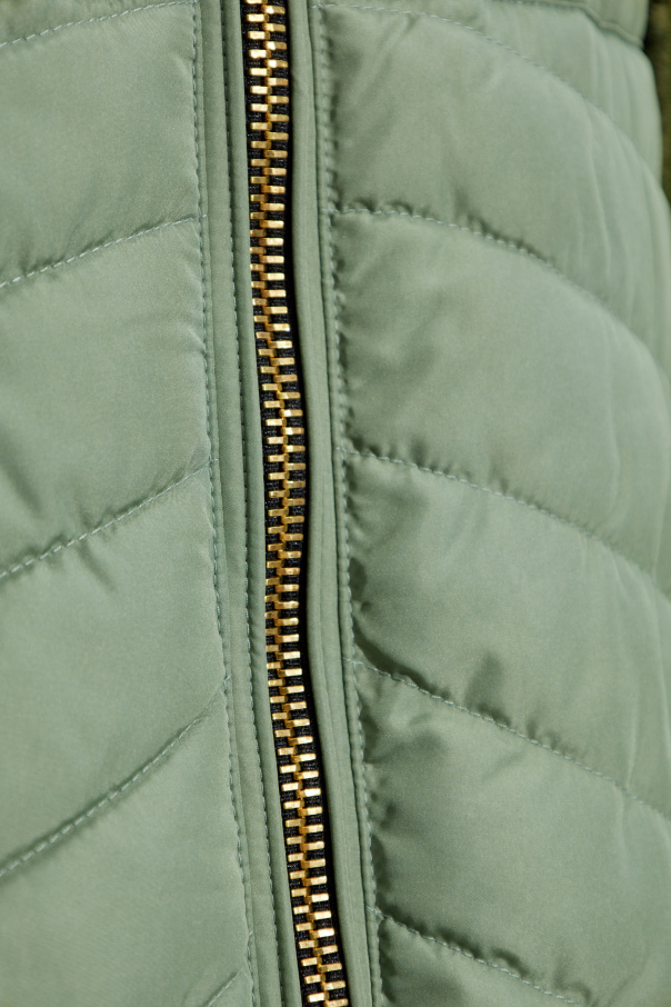 Introducing the exquisite Hooded Poncho by KhrisJoy, an epitome of modern elegance and unparalleled comfort. Rendered in a sophisticated green hue, this poncho effortlessly combines contemporary design with functional sophistication. Crafted from soft, quilted polyester, it features a loose, relaxed fit with wide sleeves reminiscent of a coat or cape. The fabric is adorned with wavy, horizontal quilting, adding texture and visual interest. A robust, gold-toned zipper runs the length of the poncho, providing a striking contrast and ease of wear. The hood enhances practicality, offering protection against wind and rain, while broad green tapes with a designer inscription lend a distinctive touch. The asymmetrical hem, longer at the back, exudes elegance and style, making this poncho a statement piece in any wardrobe. Why Choose This Product? Modern quilted design for visual appeal Luxurious polyester material for warmth and comfort Functional hood with designer tapes for added style Gold-tone zipper for a touch of opulence Asymmetrical hem for a unique silhouette Perfect for layering on cooler days