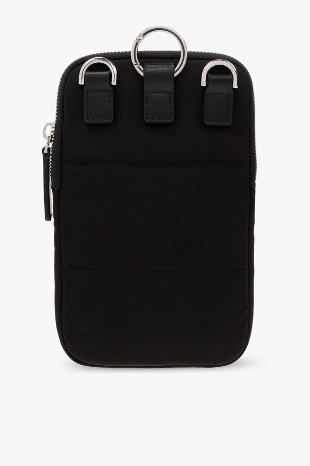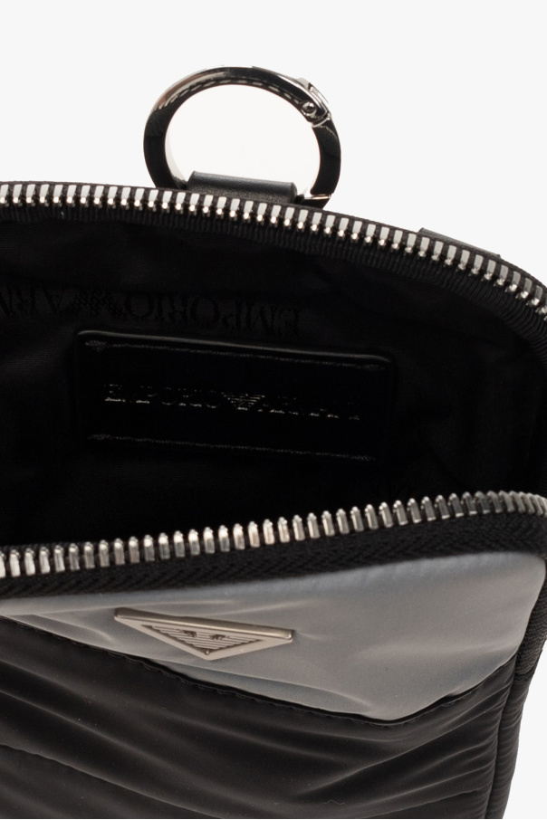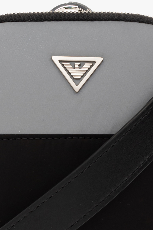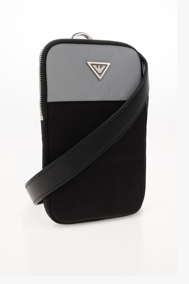 Black and grey iPhone case from Emporio Armani. Emblazoned with a logo appliqué, this item features a zip fastening, a shoulder strap, silver-tone metal hardware and one internal compartment.