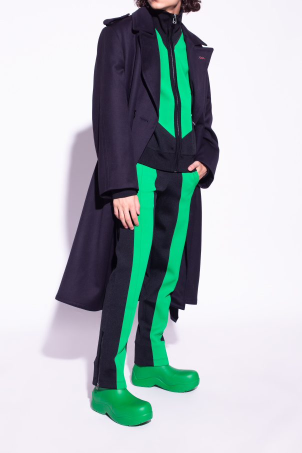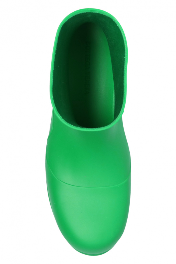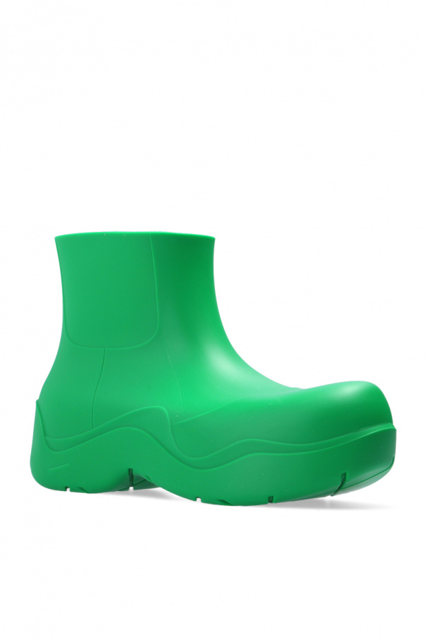 Short green ‘Puddle’ rain boots from Bottega Veneta. Made of biodegradable materials, this seamless pair features a cotton lining and a green rubber sole.