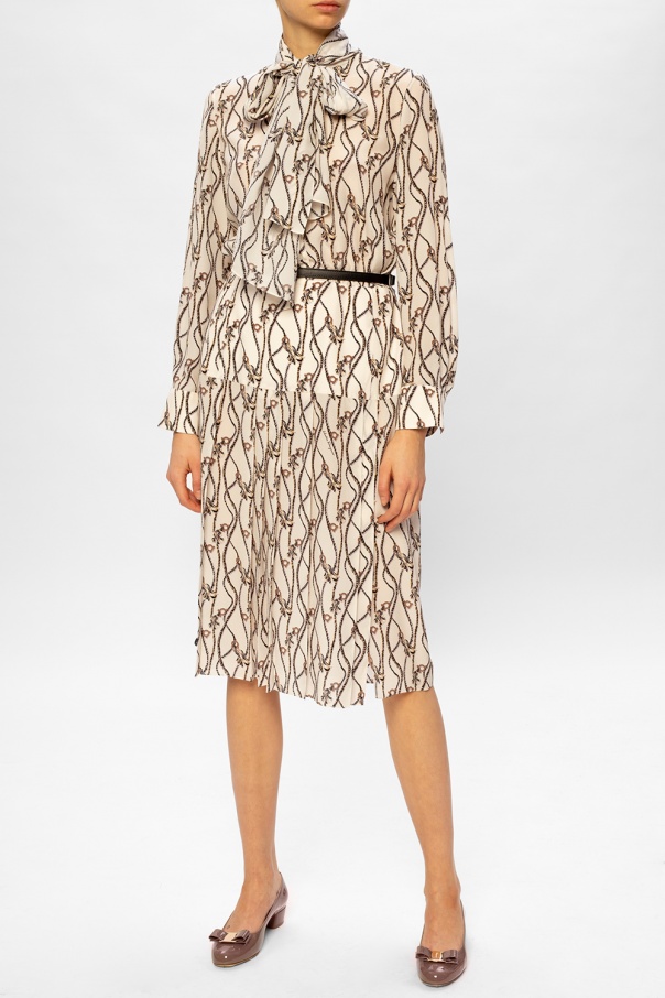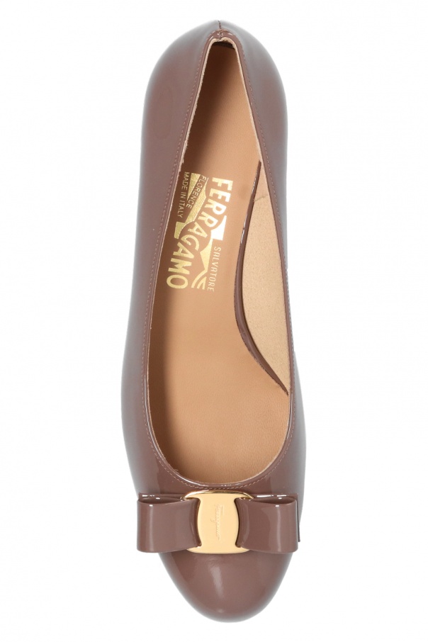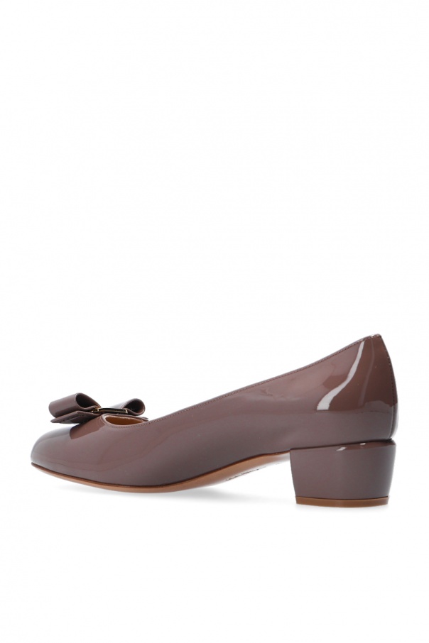 Brown ‘Vara’ heeled pumps from Salvatore Ferragamo. Made of patent leather, this model features a bow-shaped buckle with a logo and a beige leather sole.