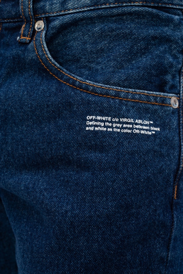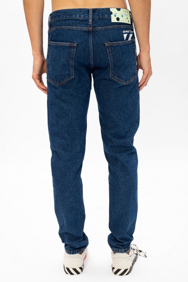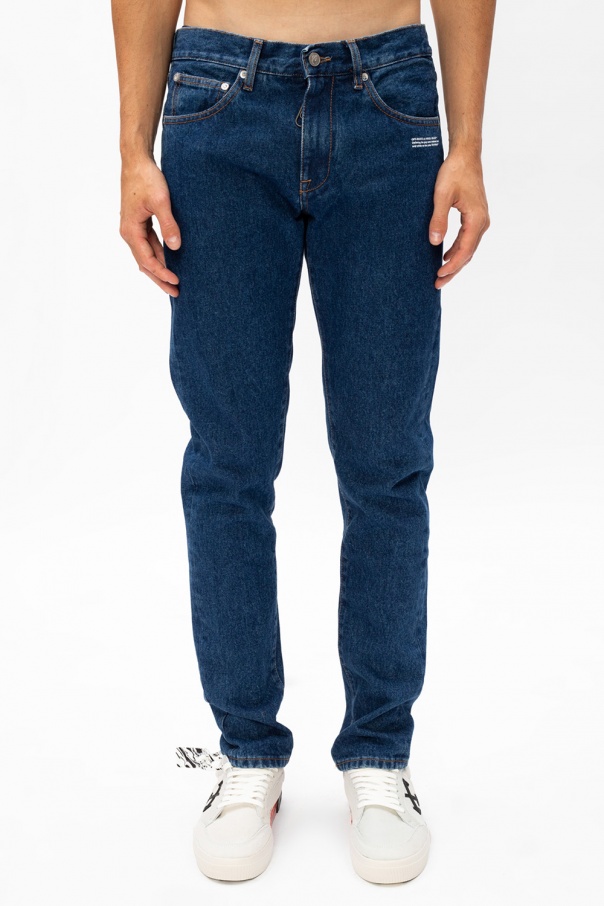 Navy jeans from Off-White. Fastened with a button and zip fly, this tapered leg design features a printed logo pattern in white and two slip pockets on the front and back.