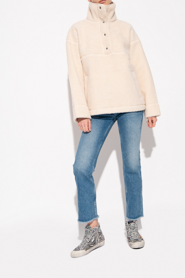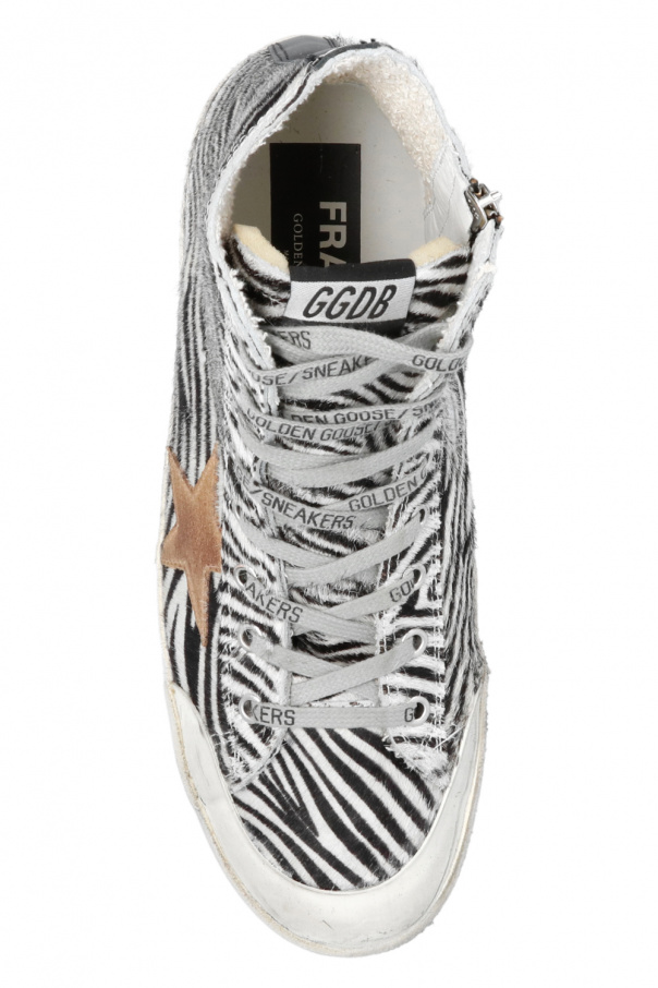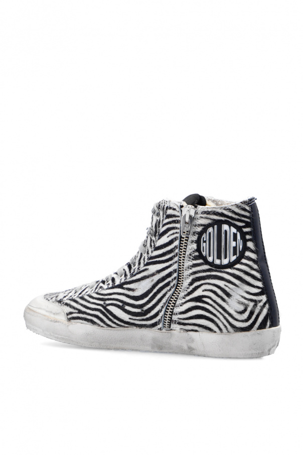 White and black ‘Francy Penstar’ high-top sneakers from Golden Goose. Crafted from leather, this lace-up model features an animal motif, a side zip closure, a brown patch, a black rubber sole and distressed effects.