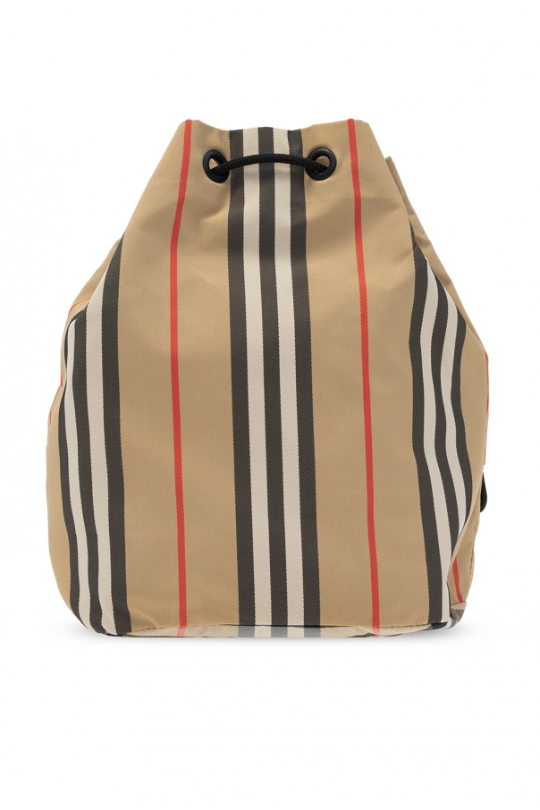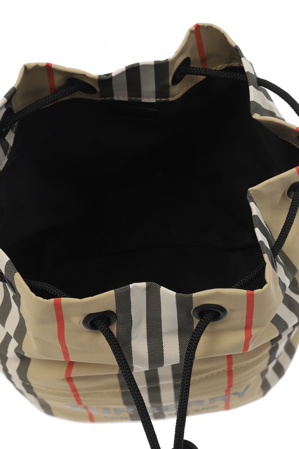 Beige handbag from Burberry. Drawstring fastening. Decorated with a colorful stripe pattern and a black logo print. Zip pocket on the front. One internal compartment.