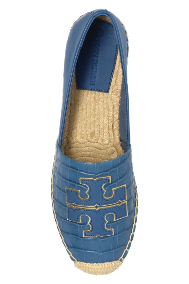 Blue ‘Ines’ espadrilles from Tory Burch. Made of calf leather with a crocodile skin effect, this pair sits on a brown rubber sole and showcases a blue and gold-tone logo patch.