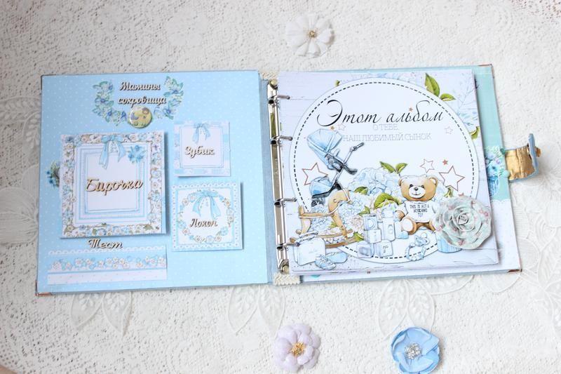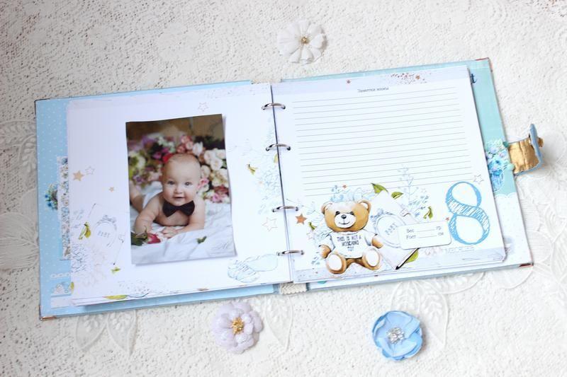 Альбом - дневник для мальчика на первый год жизни на кольцевом механизме в мягкой замшевой обложке. Внутри 35 плотных иллюстрированных листов (70 страниц) для записей и фотографий. В альбоме имеются такие разделы: