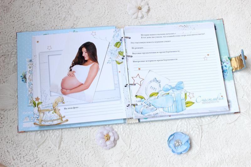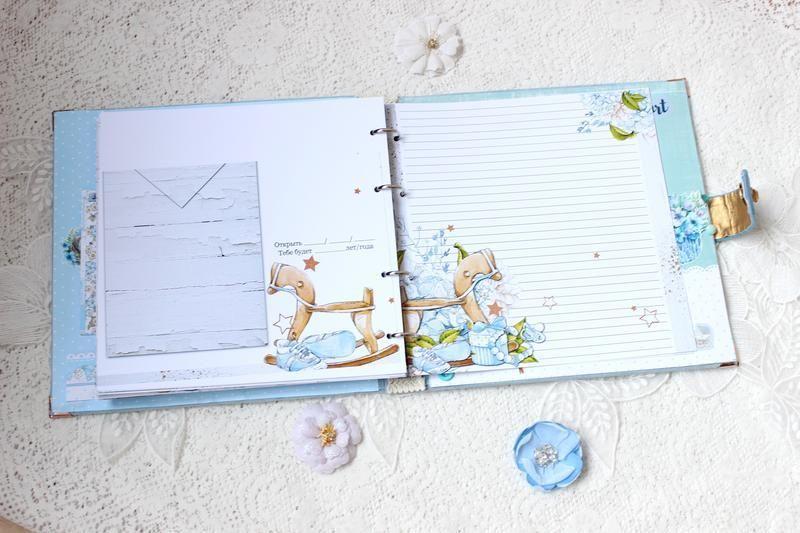 Также в альбоме декорированные форзацы, имеются конверты для бирочки, локона и зубика. В конце альбома расположен карман для дополнительных фотографий.