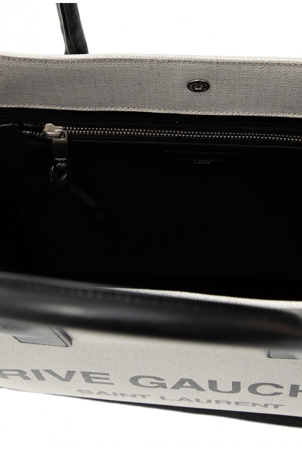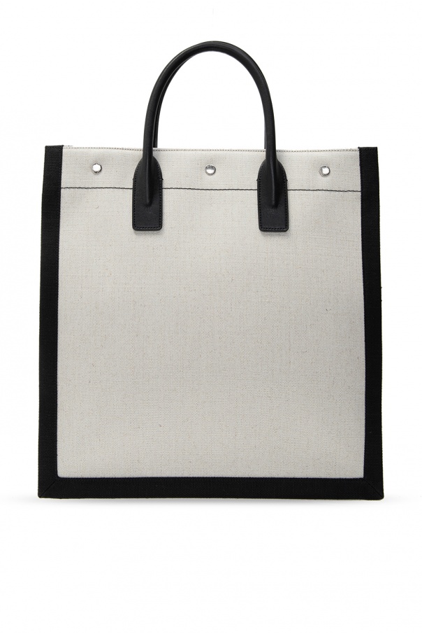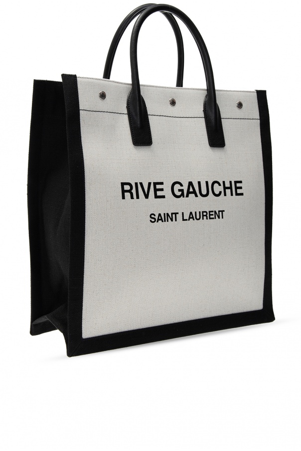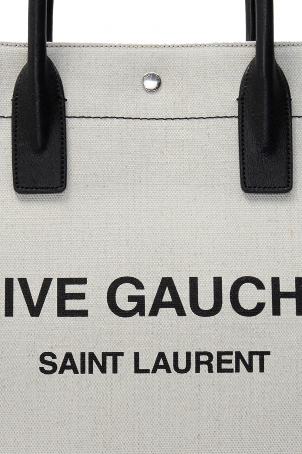 Cream shopper bag from Saint Laurent. Printed with the label's logo black, this linen-crafted design employs two half-round handles in leather, silver-tone metal hardware and interior with one compartment and one zipped pocket.