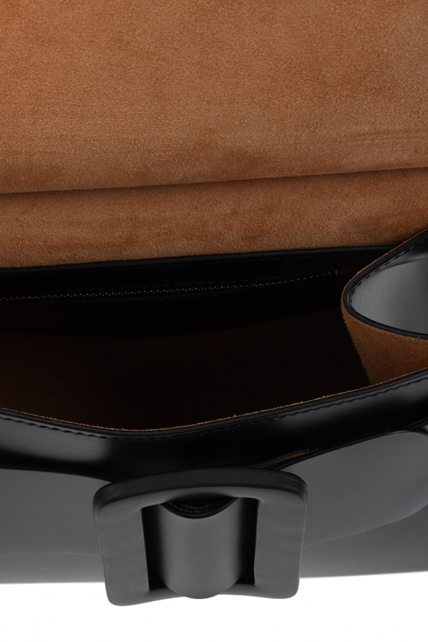Black ‘Karl 24’ handbag from Boyy. Made of calf leather, this design features a fold-over flap with a decorative buckle, a half-round strap, antiqued gold-tone metal hardware and a brown suede-clad interior with one compartment, one slip pocket and one zip pocket.