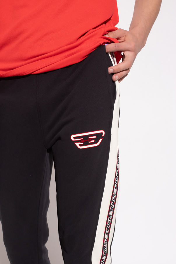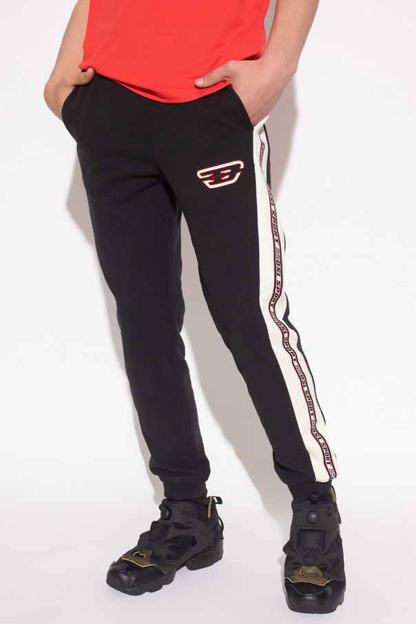 Black ‘AMSB-BOUNSS-HT02’ sweatpants from Diesel, the ‘DIESEL SPORT’ collection. Crafted from cotton and decorated with a logo patch, this pair features a drawstring waistband, three slip pockets, elasticated cuffs and white panels down the sides.