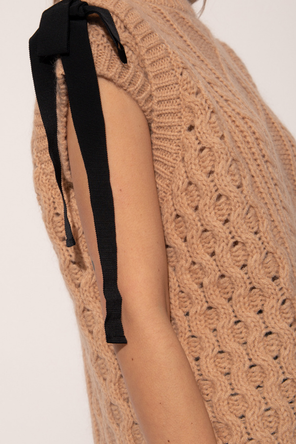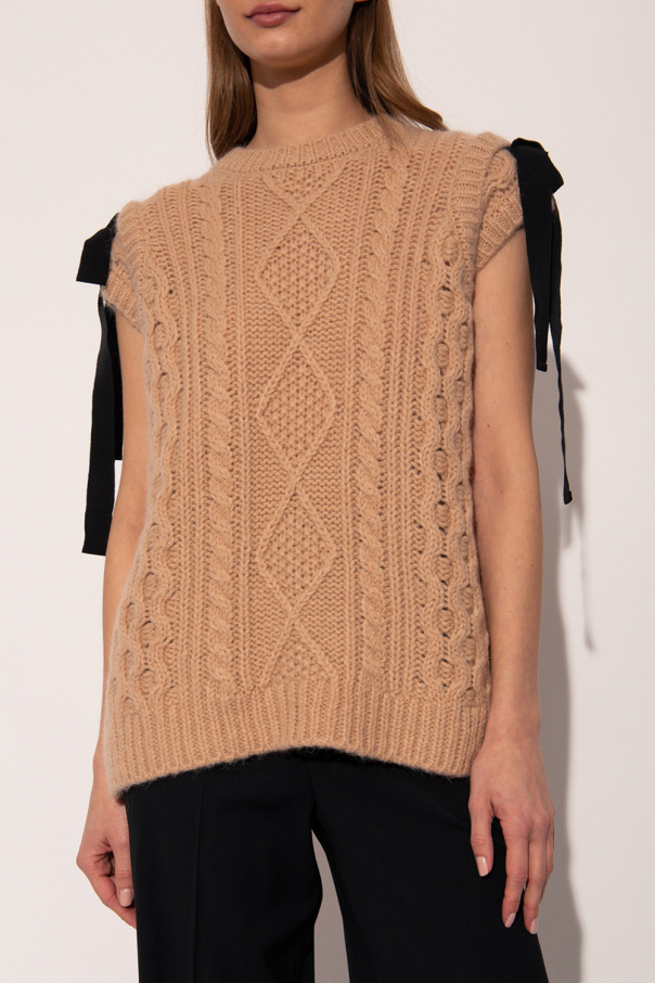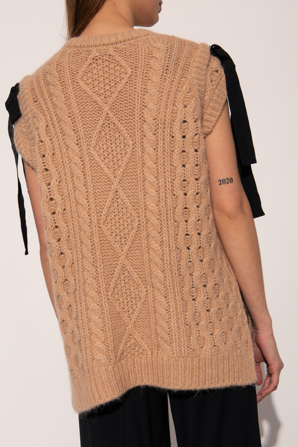 Beige crewneck vest from Red Valentino. Embellished with a decorative knit and black bows, this style features ribbed trims on the edges.