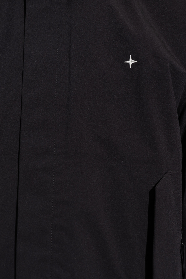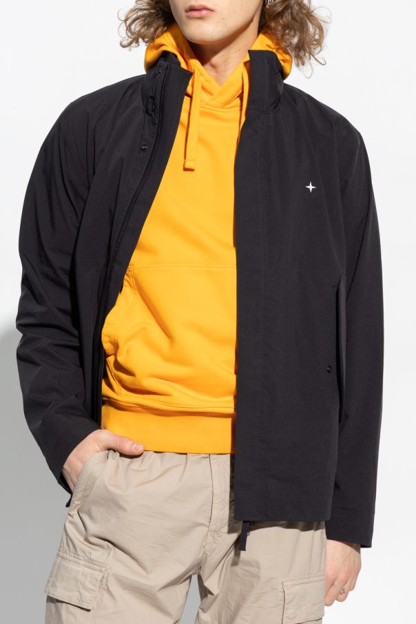 Black jacket from Stone Island. Coated with windproof and waterproof membrane, this style fastens with a two-way zipper and snaps and features a hood concealed in the standing collar, white logo embroidery, two zip pockets, two flapped pockets with snaps and long sleeves with snap-fastened cuffs.