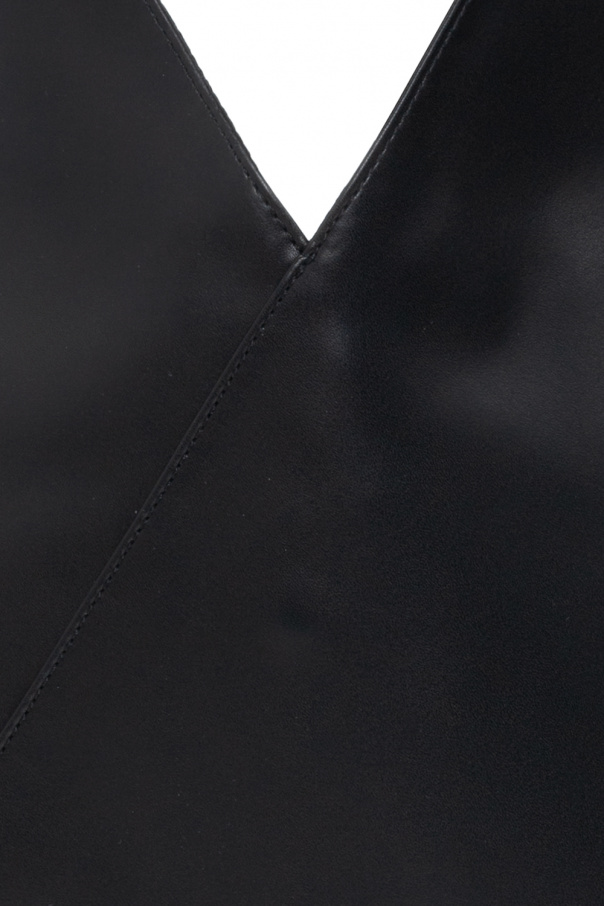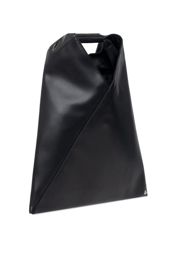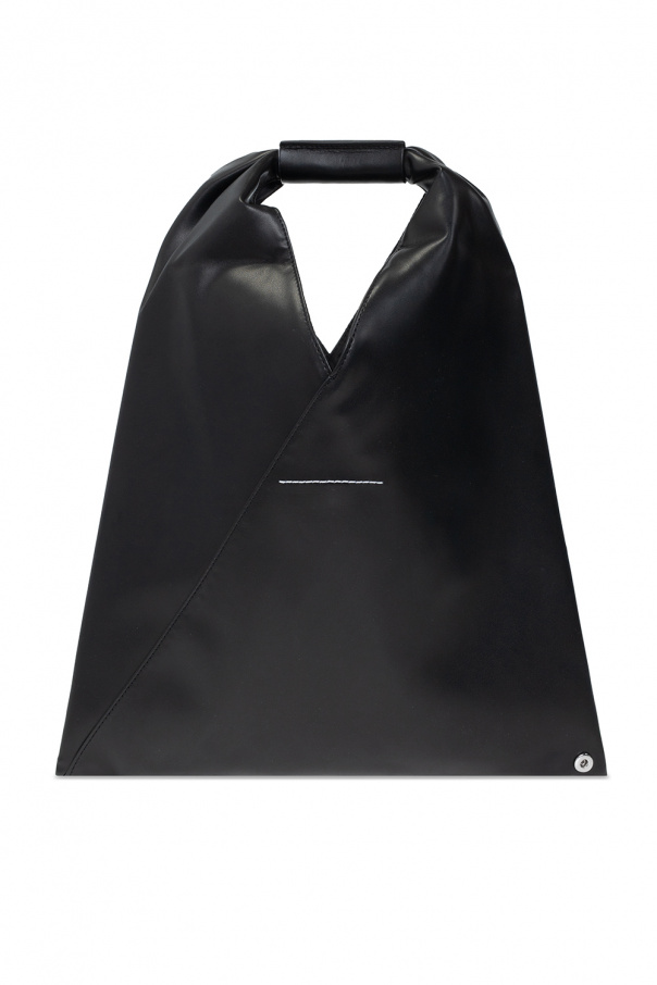 Black ‘Japanese Small’ handbag from MM6 Maison Margiela. Inspired by the traditional Japanese technique of origami, this faux-leather design showcases a triangular shape, a snap fastening, the brand's signature contrasting white four-stitches moniker at the back, a rigid handle with an embossed logo and one internal compartment with a snap-fastened pocket.