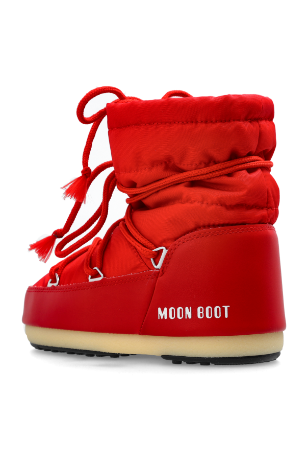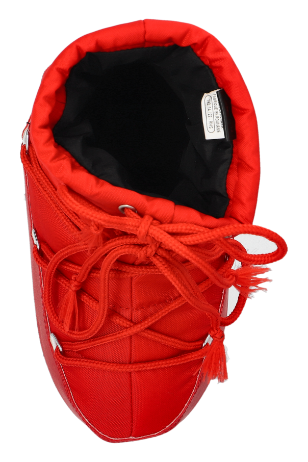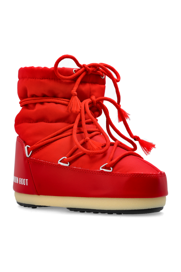 Red ‘Light Low’ snow boots from Moon Boot. This pair features double tie fastenings, white logo print and rubber sole in cream and black. Inspired by the peculiar shape and technology of the astronauts’ boots, the iconic style was designed in 1969 after the first Moon landing.