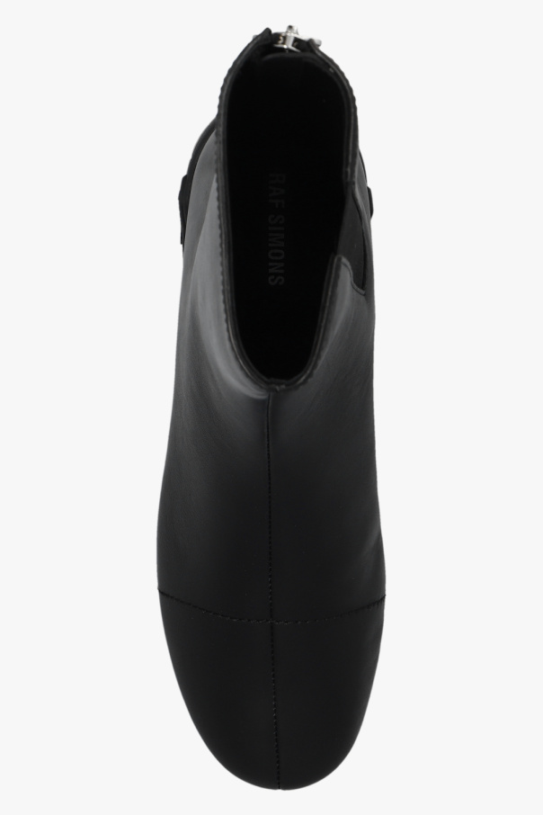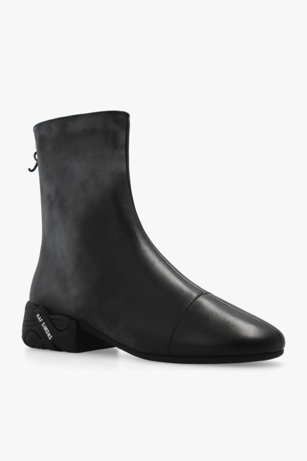 Black ‘Solaris’ heeled ankle boots from Raf Simons. Crafted from leather, this model sits on a black rubber sole and showcases a back velcro closure, logo detailing and elastic panels on the sides.