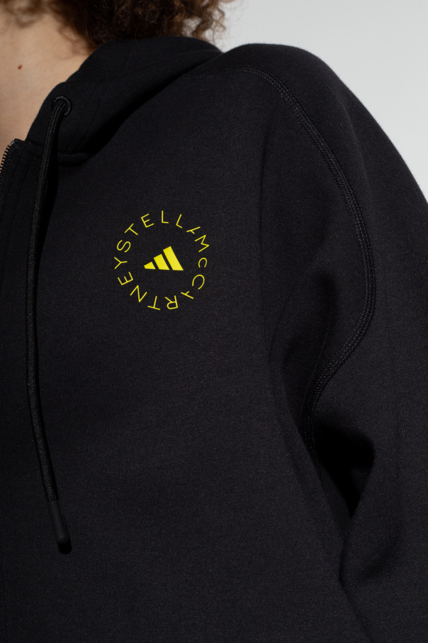 Black loose-fitting cropped hoodie from ADIDAS by Stella McCartney. Made of a blend of organic cotton and recycled materials, this design features a two-way zip, drawstring hood, yellow logo print and ribbed trims at the hem and cuffs.
