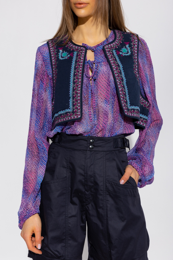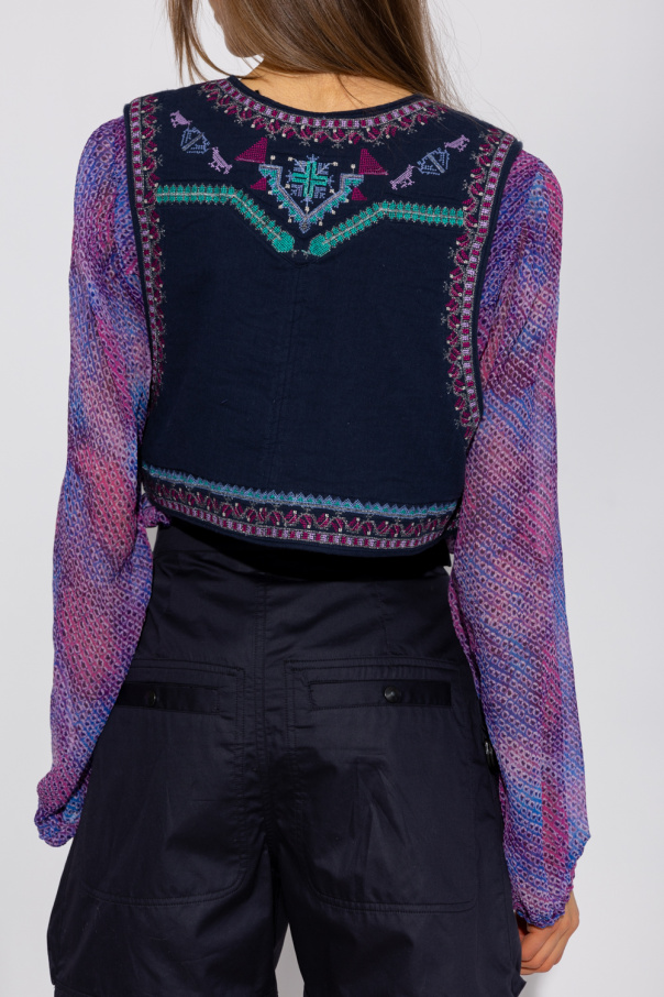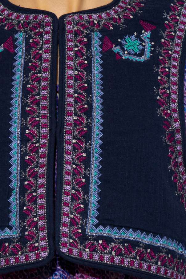Navy blue ‘Cruz’ short vest from Isabel Marant. Made of cotton, this style features a round neck, hook & eye closures, a silk lining and colourful graphic embroidery inlaid with silver-tone lurex thread.
