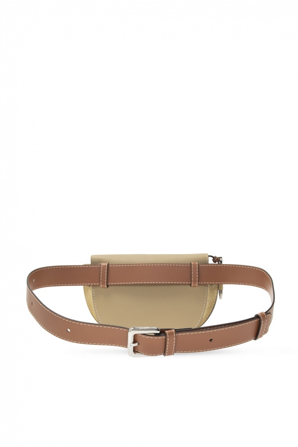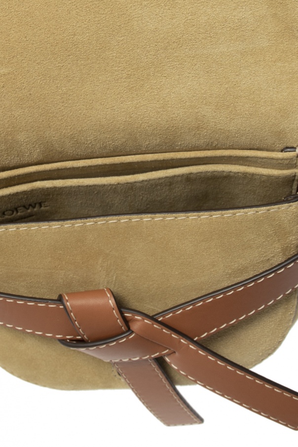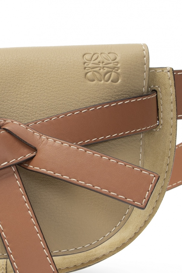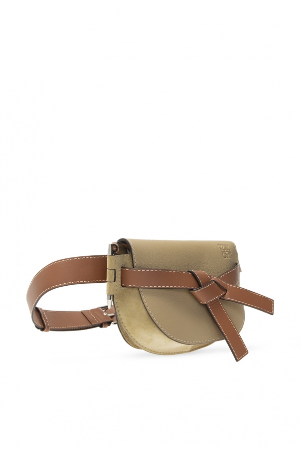 Beige ‘Gate’ belt bag from Loewe. Size large. Crafted from calf leather with suede trims, this item fastens with a magnetic closure and comes decorated with an embossed logo. It is complete with a decorative strap, detachable and adjustable belt and one internal compartment with two slip pockets.