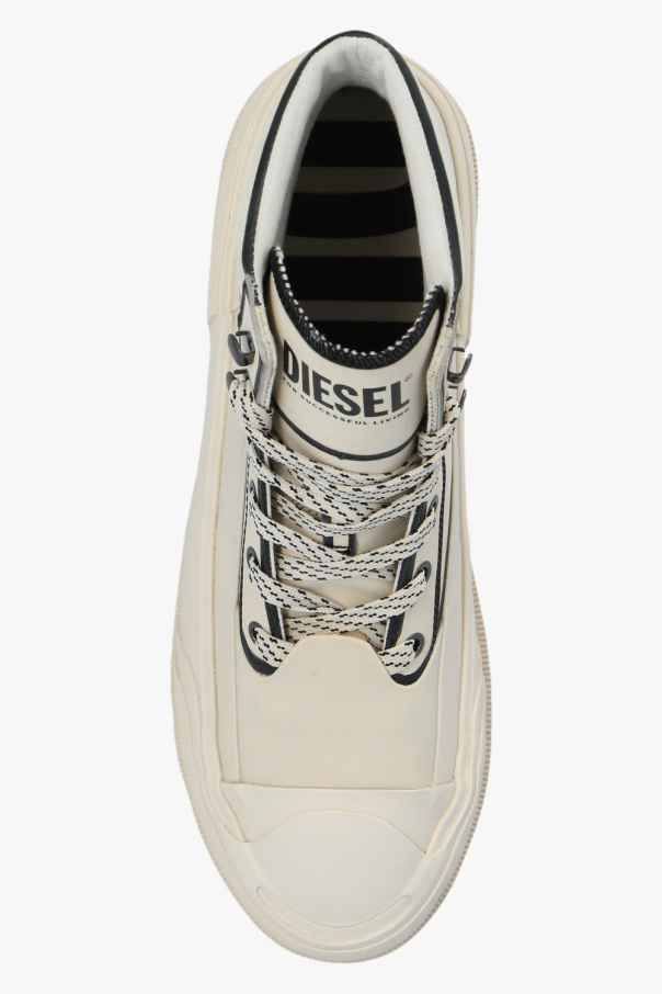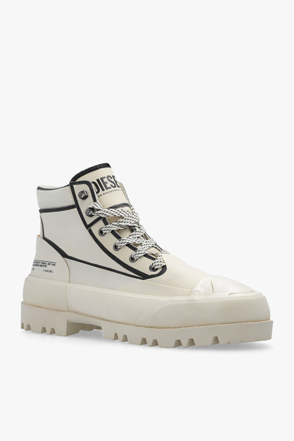 Cream and black ‘D-HIKO SH X’ boots from Diesel. Made of leather, this lace-up pair inspired by combat boots is complete with a logo print on the tongue, rubber trimming, black lettering on the side and cream chunky sole made of vulcanized rubber.