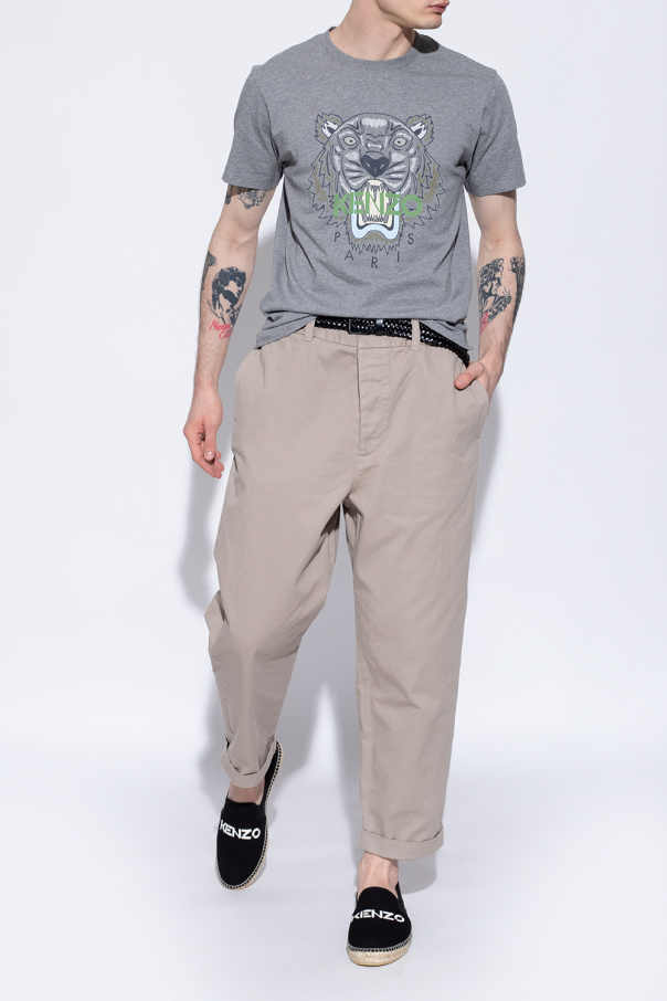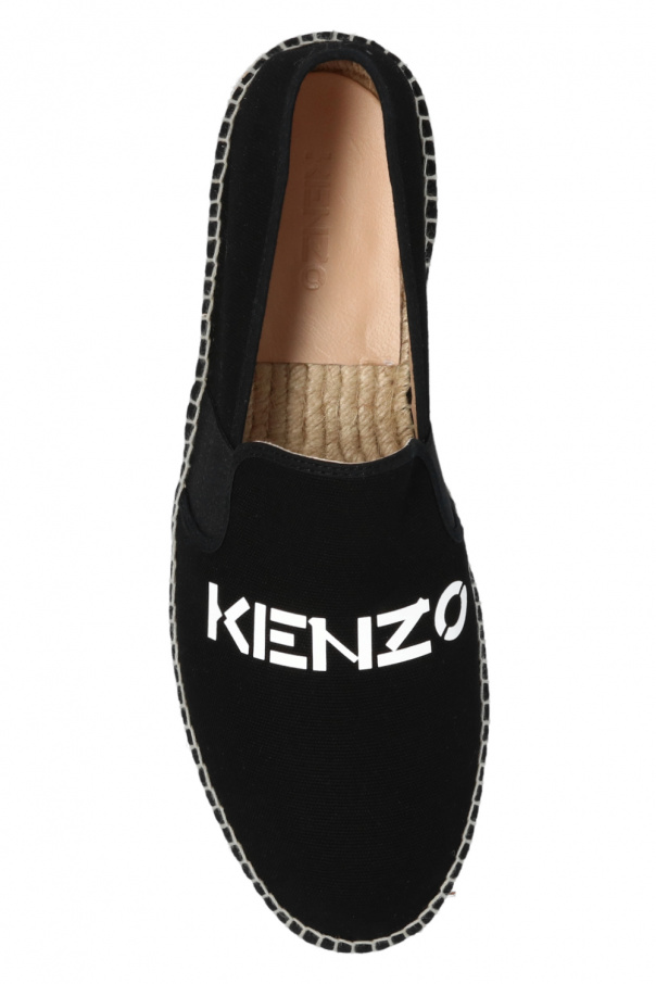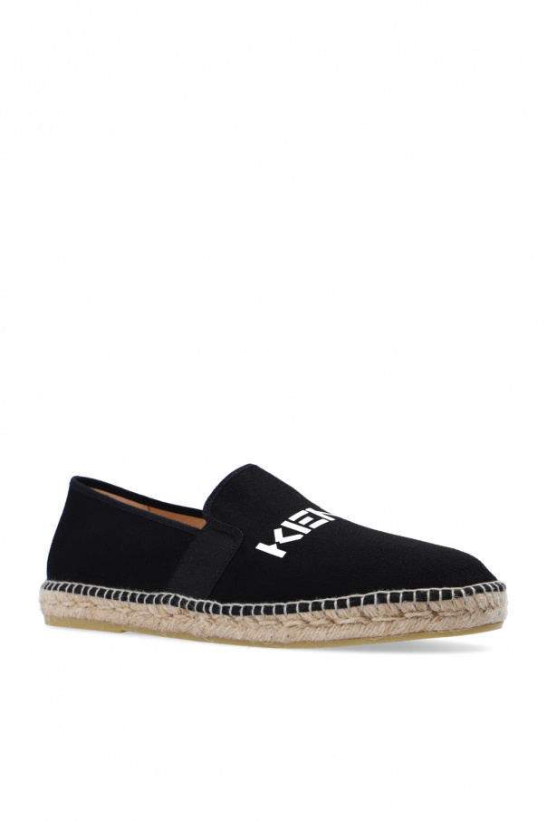 Black and beige espadrilles from Kenzo. Made of cotton, this pair features a white logo print, elastic bands on the sides and a beige rubber sole.