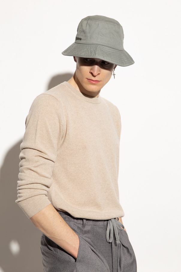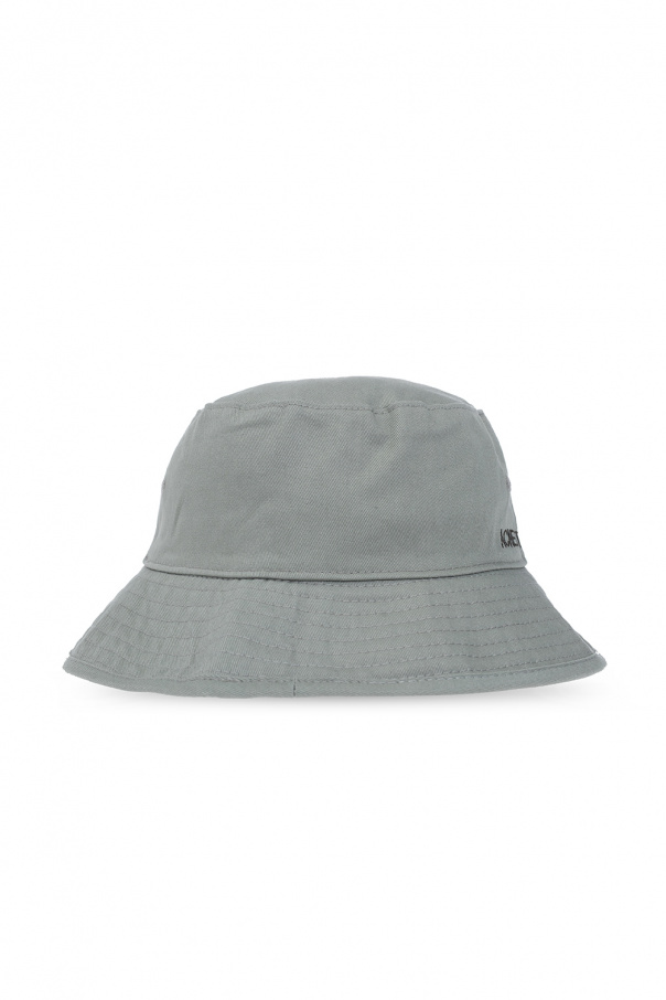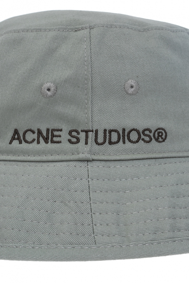 Green and grey bucket hat from Acne Studios. Made of cotton, this item showcases black logo embroidery on the front.