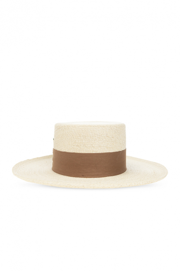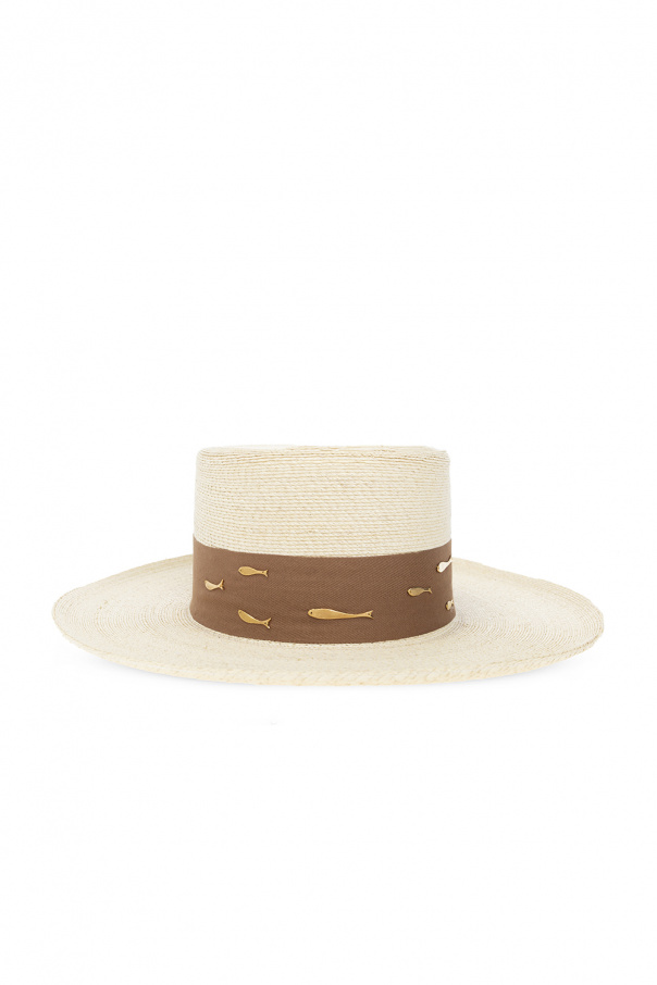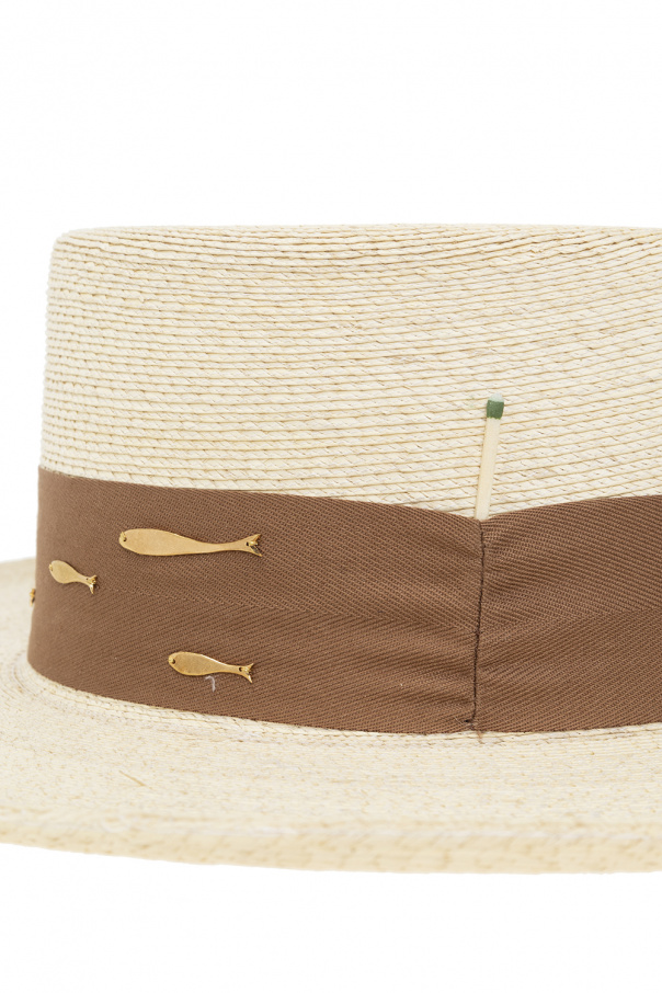 Light beige ‘Vaquero’ hat from Nick Fouquet. Made from straw, this item features the brand's signature matchstick on the side and a brown grosgrain band accentuated with gold-tone animal-motif applications