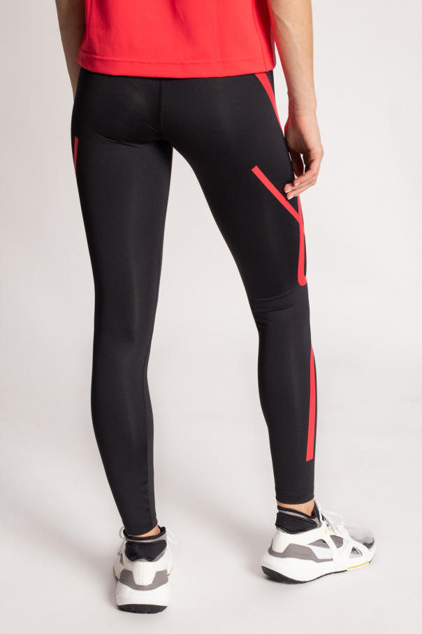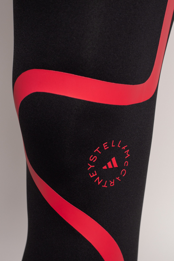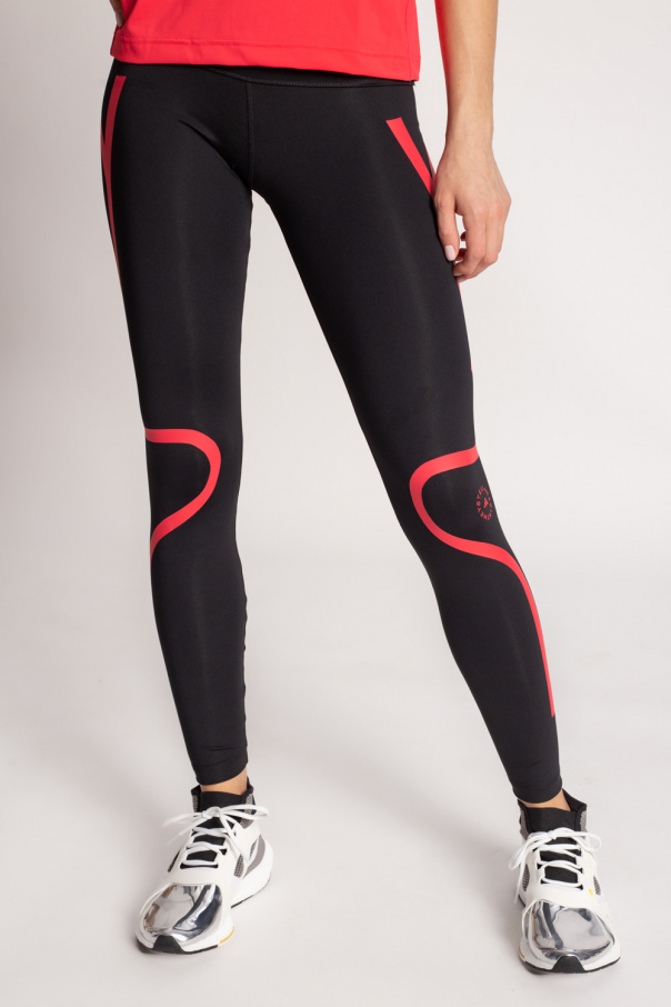 Black leggings from ADIDAS by Stella McCartney, the ‘Primeblue’ line. Crafted from moisture-absorbing AEROREADY fabric, this pair features a drawstring waist, a red logo pattern, a silver-tone reflective stripe and a back zip pocket. Primeblue is a performance fabric made with Parley Ocean Plastic, which is created from recycled plastic waste intercepted from beaches and coastal communities before it reaches the oceans. Products made of Primeblue contain a minimum of 40% recycled material in total.