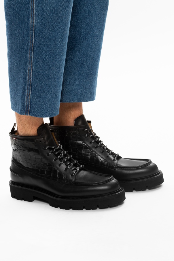 Black ‘Lysius’ platform ankle boots from Bally. Crafted from calf leather with a crocodile skin effect, this lace-up design features a sewn-on logo detail in silver-tone and a black rubber sole.