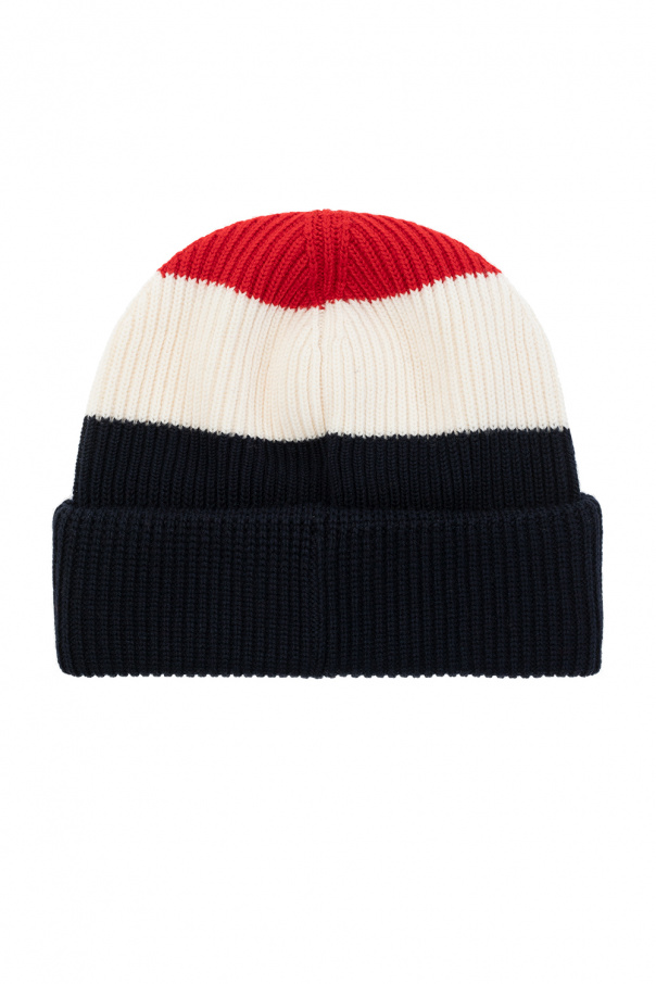 Red, cream and navy hat with a logo patch from Moncler. Made of wool.