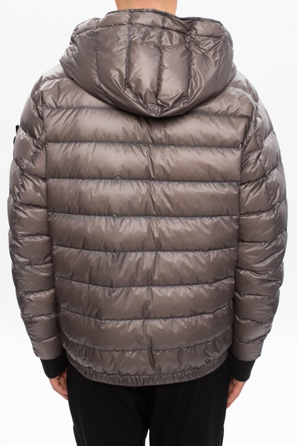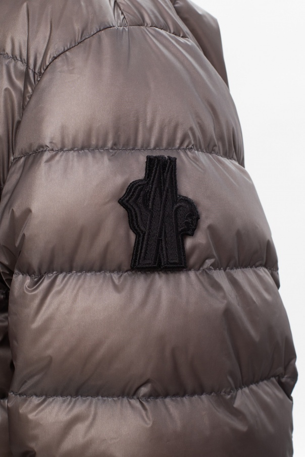 Grey and blue 'Jayer' quilted jacket from Moncler Grenoble. Padded with goose down, this wintry garment showcases graphic print and logo appliqué for the brand recognition. It is complete with two-way zip and snap fastenings and two snap-fastened frontal pockets.