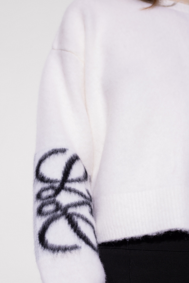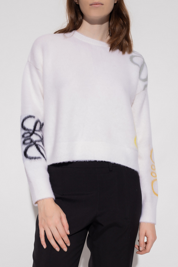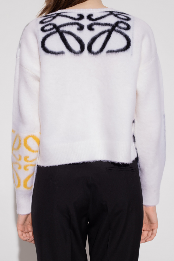 White sweater from Loewe. Made of wool, this garment is enriched by a multicolored logo pattern and ribbed trims at the crew neck, hem and cuffs.