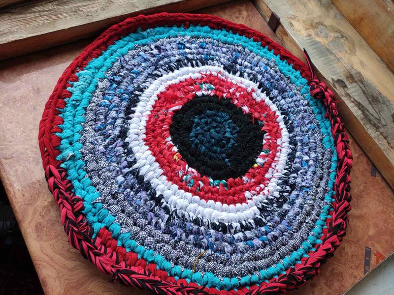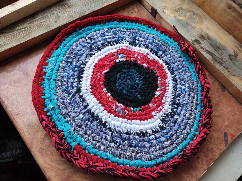 Сделан вручную моей мамой из лоскутков, оставшихся на производстве одежды.Диаметр = 54 см