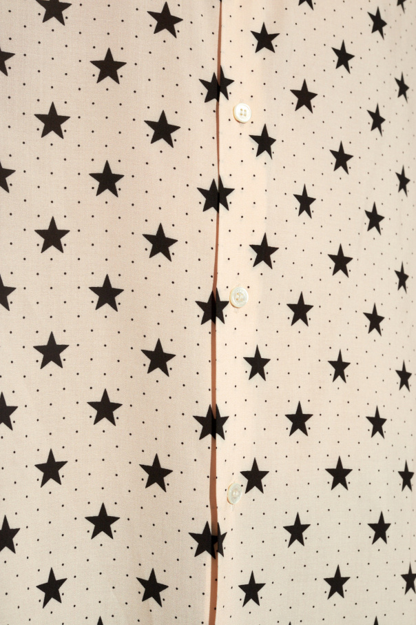 Beige shirt from Balmain. Flaunting a pattern with stars and dots in black, this style features an oversize fit, short sleeves and a round mock neck.